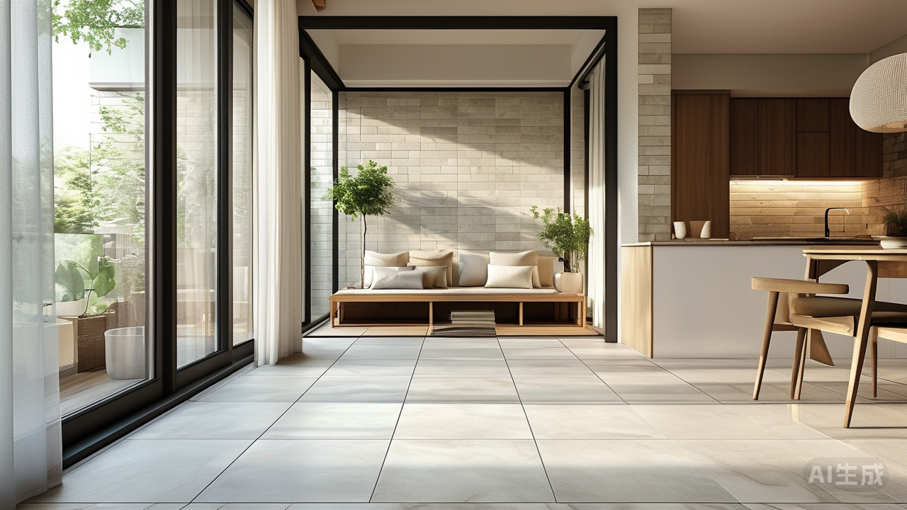 通铺虽妙,却非一铺到底的固化陈规。空间自有其流动的呼吸,巧妙分区恰如温柔点拨。开放式小宅中,厨房与餐厅浑然一体,不妨以一方防滑、易洁的哑光砖悄然界定烹饪之域;玄关入口处,几块跳色花砖或别致纹理砖,便自然划出一方迎送天地,既不生硬切割整体,又默默承担功能之需。这区分如同溪流遇石,自然转圜,无声引导空间节奏。区域感立现,格局却依旧舒展自在,毫无凝滞之感。 砖石之选,更关乎小宅的气质与呼吸。浅淡色泽素来有扩张之能,米白、浅灰铺陈,空间恍若后退几分;纹理细腻者,如微水泥质感或素雅石纹,其低调内敛不喧宾夺主,反衬出空间本身;砖面或润泽或哑光,一束天光洒落其上,折射或吸收之间,悄然影响空间的明暗层次与视觉深度。材质无声,却默默参与了空间的呼吸与尺度。