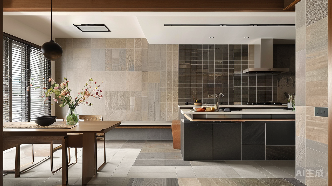 小户型空间虽有限,却可通过瓷砖巧妙划分功能区域,同时维持整体和谐。温和过渡是常用手法:客厅与餐厨区选用同色系但纹理略有差异的瓷砖,或使用同一款砖但改变铺贴方向(如客厅横铺、走道竖铺),既自然区分空间又保持视觉连贯性。在玄关、厨房操作区等小范围区域,点缀精致小花砖或少量个性深色砖,既能聚焦视线形成趣味点,又不破坏整体通透感,为小空间注入灵动生机。